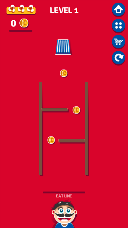Ukończ poziom: Dostarcz popcorn do ust zjadacza popcornu, upewniając się, że wypadną mniej niż trzy kawałki, aby ukończyć każdy poziom i przejść do następnego.