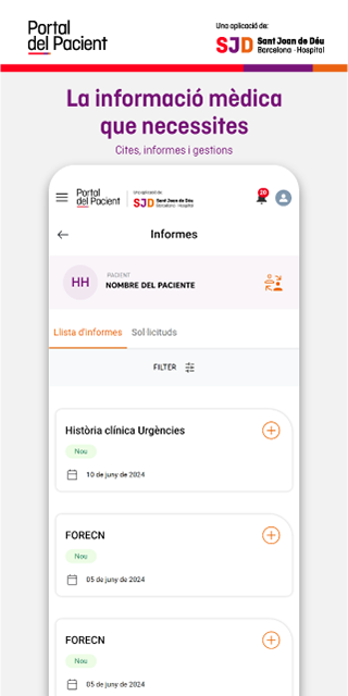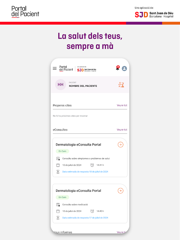 Portal Pacjenta to platforma internetowa i aplikacja mobilna Szpitala Sant Joan de Déu, stworzona w celu ułatwienia komunikacji pomiędzy rodzinami a szpitalem. Za pomocą preferowanego urządzenia z łatwością zarządzaj codziennymi czynnościami w szpitalu, aktualizuj dane kontaktowe, konsultuj i proś o zmiany w danych pacjentów powiązanych z Twoim profilem.
