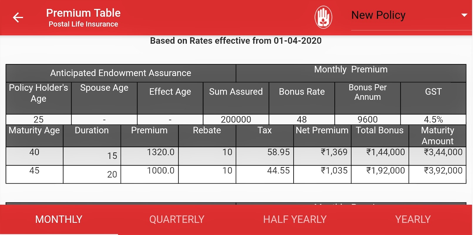 Departament oferuje różne rodzaje polis ubezpieczenia na życie za pośrednictwem pocztowego ubezpieczenia na życie i wiejskiego pocztowego ubezpieczenia na życie. Użytkownicy mogą sprawdzić składkę należną za wszystkie kwalifikujące się rodzaje polis pocztowych / wiejskich pocztowych na życie na podstawie wprowadzonych danych wejściowych.
