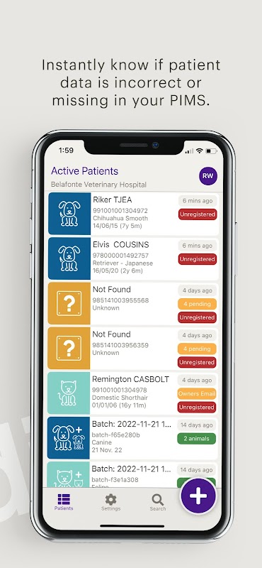 Przeglądaj zeskanowanych pacjentów w aplikacji Vedi. Z łatwością przeglądaj ich dane, upewniając się, że są prawidłowe i są zarejestrowane w lokalnym rejestrze mikrochipów.