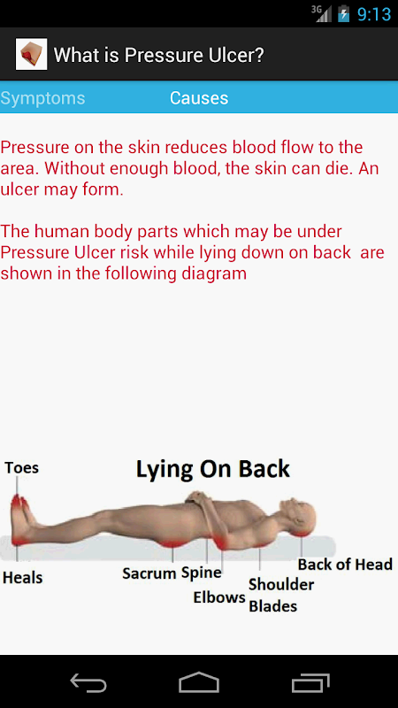 The sores, known as pressure ulcers, cause hundreds of deaths a year. Most victims are elderly or long-term patients who need help to move. We can reduce the risk of pressure ulcer by using this pressure ulcer guide. Therefore, join us by using this App to save patient and elderly people from sores. Keep in mind that prevention is cheaper than the treatment.