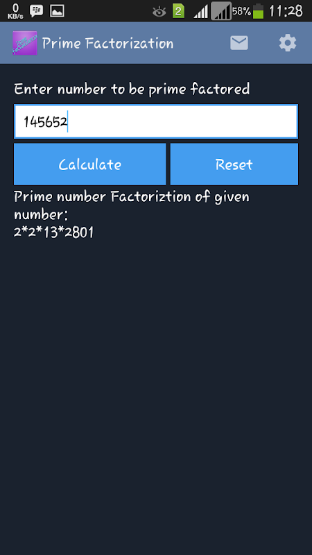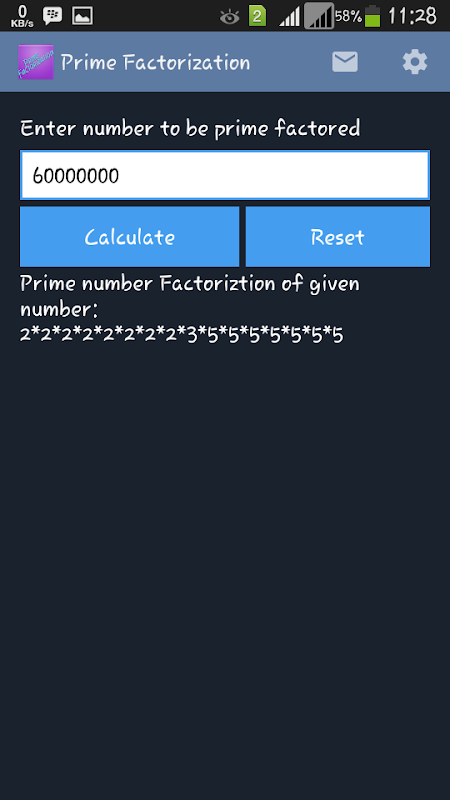 This Prime Factorization app converts the given number into product of prime numbers. The app can be also used for testing if the given number is a prime number (returns a message saying “It’s a prime number and cannot be factorised in to prime factors” if given number is a prime number) This app gives results in a very quick time. Very useful App for school and college students.