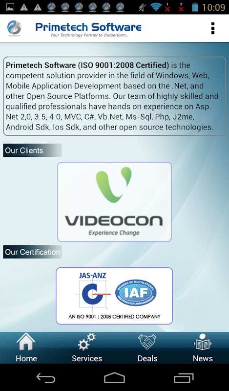Primetech Software (ISO 9001:2008 Certified) is the competent solution provider in the field of Windows, Web, & Mobile Application Development based on the .Net, and other Open Source Platforms. Our team of highly skilled and qualified professionals have hands on experience on Asp.Net 2,0, 3.5, 4.0, MVC, C#, Vb.Net, Ms-Sql, Php, J2me, Android Sdk, Ios Sdk, and other open source technologies. Our expertise is in converting business models to effective long-lasting business software solutions.