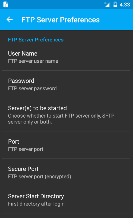 Prosty serwer FTP. Pozwala na wymianę plików z innymi maszynami przez WiFi. Nie więcej Kabel USB wyszukiwanie. Działa bez uprawnień administratora. Nie jest uruchomiona, gdy buty urządzeń (ale może, jeśli chcesz). Opanuj się, gdy serwer działa. Podczas działania zapobiega gotowości, aby uniknąć długich przesyłanie i pobieranie przerwać (konfigurowalne). Transfery mogą być szyfrowane przez SFTP.