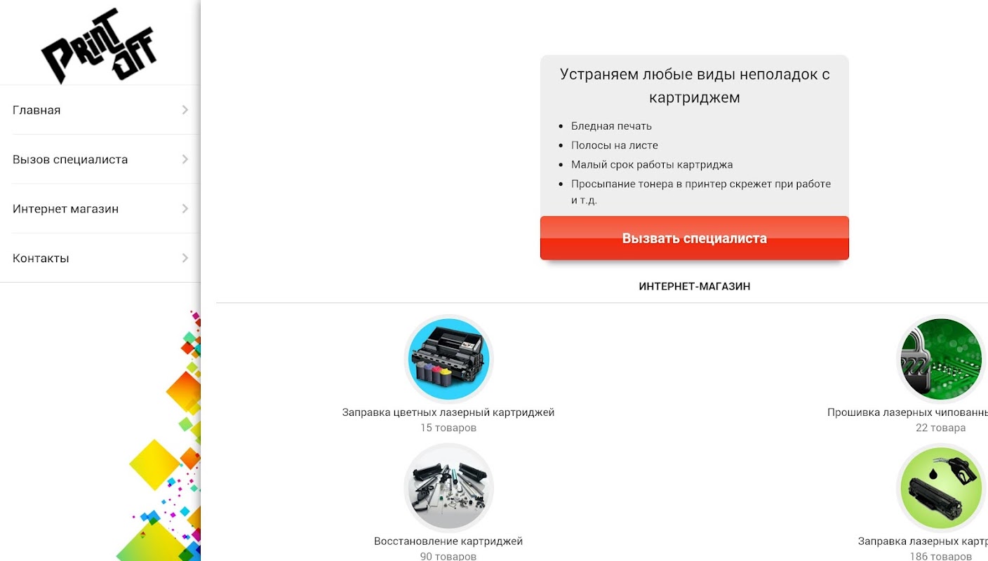 Сделайте из приложения заказ на заправку картриджей, ремонт ноутбука, либо монтаж локальных сетей и получите скидку 15%.