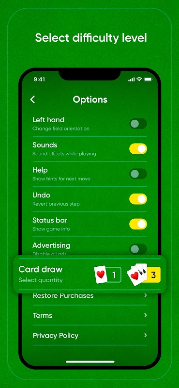 Aplikacja gry ma intuicyjne i proste sterowanie, przesuwanie kart jednym dotknięciem, łatwe przeciąganie stosów. W ustawieniach możesz wybrać grę prawą lub lewą ręką. Ustaw łatwy tryb z rozdawaniem jednej karty lub trudniejszy z rozdawaniem trzech kart. Możesz wstrzymać grę bez utraty bieżącego postępu i wznowić ją później, jeśli musisz zrobić coś innego.