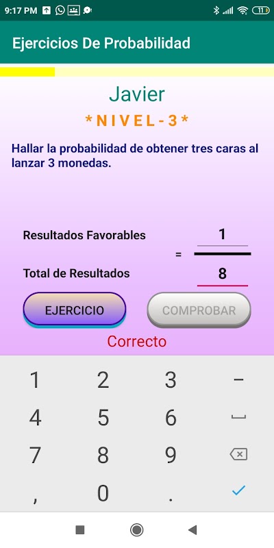 La aplicación “Probabilidad” ofrece ejercicios básicos de probabilidad, constan de 10 niveles que se activan cada vez que se realiza 5 ejercicios correctos en serie.