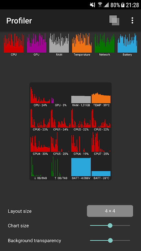 Monitorowanie komponentów w czasie rzeczywistym w ruchomym oknie. Możesz dostosować układ, jego rozmiar i przezroczystość. Możesz ustawić preferowany format danych i kolor wykresu dla lepszej przejrzystości.