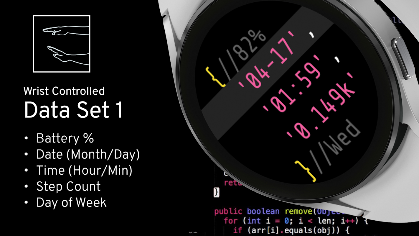 Coder 2 – idealna tarcza zegarka dla programistów, developerów IT i programistów. Innowacyjna, interaktywna, zabawna i z mnóstwem motywów składniowych kodu. 2 zestawy danych sterowane na żywo z nadgarstka – delikatnie przechyl nadgarstek, aby uzyskać dostęp do drugiego zestawu danych. Projekt obejmuje komentarze do kodu, podświetlanie składni, nawiasy klamrowe, pojedyncze cudzysłowy… co tylko zechcesz!
