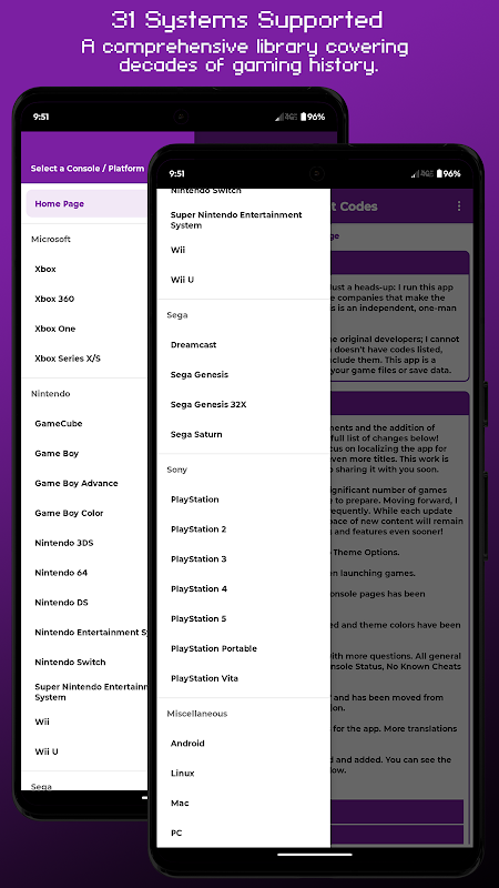 Witamy w Project Cheat Codes – niezbędnym towarzyszu każdego entuzjasty gier retro. Masz dość przerywania gry, by przeszukiwać niezliczone strony internetowe w poszukiwaniu jednego kodu? Rozwiązaliśmy ten problem. Nasza aplikacja zapewnia natychmiastowy, w 100% offline dostęp do tysięcy zweryfikowanych kodów do najbardziej kultowych klasycznych konsol.