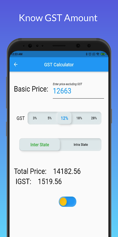 -Easily use the GST calculator: Enter the net price of a service or good and select the GST slabs such as 5%, 12%, 18% and 28%. It automatically shows the final or gross price of goods and services. You can use it vice versa too i.e. entering gross and getting basic price.