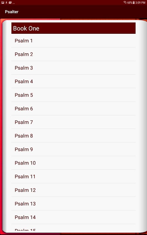Ta aplikacja jest oparta na rozdziale Psałterza w Księdze wspólnej modlitwy z 1979 r. (Kościół episkopalny) od strony 581. Celem aplikacji jest zapewnienie łatwego dostępu do 150 psalmów za pomocą prostego w obsłudze interfejsu. Mam nadzieję, że ty i twoja rodzina znajdziecie tę aplikację wzbogacającą duchowo wasze dusze i czerpię radość z niej tak samo, jak z moją rodziną.