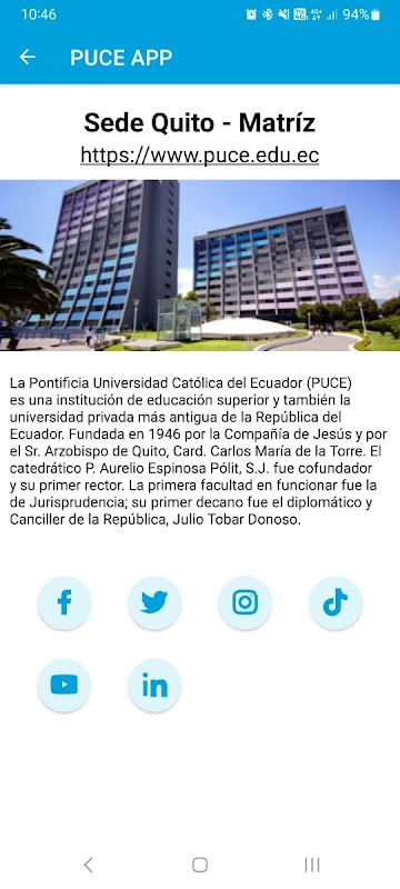 Aplikacja PUCE została zaprojektowana w celu poprawy komfortu użytkowania na Pontificia Universidad Católica del Ecuador (PUCE). Dzięki szerokiemu zakresowi usług nasza aplikacja ułatwia dostęp do niezbędnych informacji i przydatnych narzędzi uczniom, nauczycielom i pracownikom administracji.