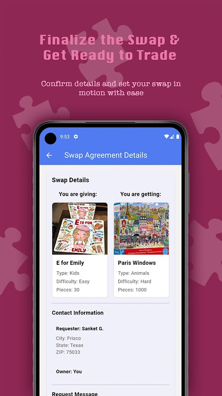 Przeglądaj rosnącą kolekcję puzzli udostępnianych przez innych układaczy, przeglądaj szczegółowe oferty z notatkami o stanie i poproś o wymianę za pomocą kilku kliknięć. Śledź wszystkie swoje prośby w jednym miejscu i łatwo potwierdzaj umowy dzięki jasnym wskazówkom krok po kroku.