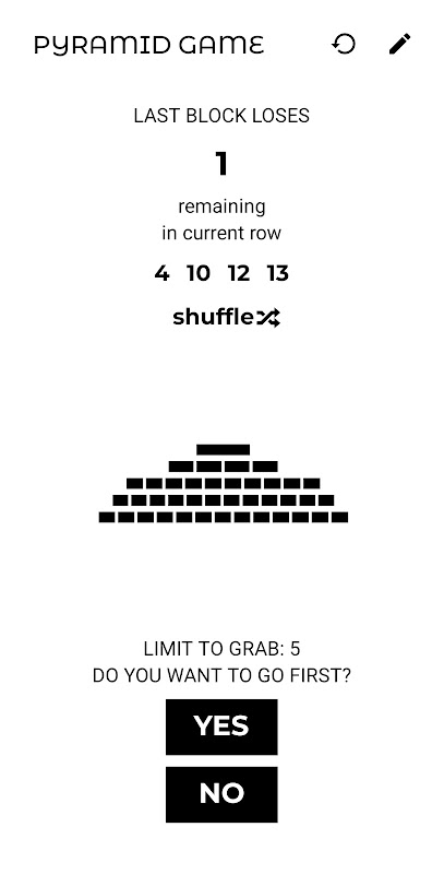 Przetestuj swoją strategię w tej wariacji na temat klasycznej gry logicznej Nim! Dostosuj układ piramidy, maksymalną liczbę bloków w rzędzie i liczbę elementów, które można wziąć w każdej turze. Każda gra jest inna, a dzięki funkcji tasowania nie ma dwóch takich samych układów piramid. Graj solo lub rzuć wyzwanie znajomemu w trybie lokalnym i zobacz, kto przechytrzy przeciwnika, nie zabierając ostatniego bloku!