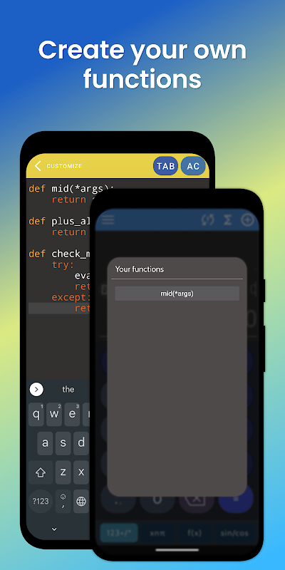 Python Calculator to wielofunkcyjna aplikacja. Kalkulator jest oparty na Pythonie 3.10 (3.8 w PRO) i zintegrowanej bibliotece 'math'. Tutaj możesz również użyć kompilatora Pythona (interpretera) i napisać własne specyficzne funkcje, używając go w kalkulatorze.