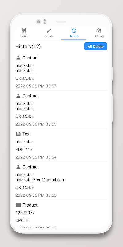Menedżer kodów QR może odczytywać i odszyfrowywać wszystkie typy kodów QR, w tym kontakty, produkty, adresy URL, Wi-Fi, tekst, książki, e-maile, lokalizacje, kalendarze itp.