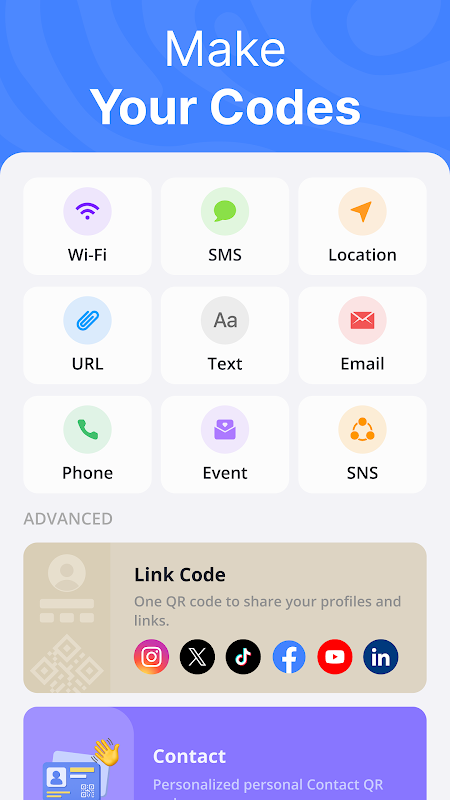 Twórz własne kody QR dla adresów URL, informacji kontaktowych i nie tylko w skanerze kodów QR! Udostępniaj własne kody z aplikacji do skanowania kodów QR.