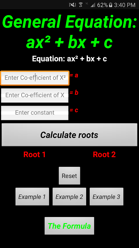 With this app you can solve the toughest of the quadratic equations in just a few seconds. Just enter the three coefficients and hit the "Calculate roots button" to get the 2 roots for your quadratic equation.