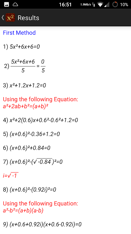 Quadratic Equation Solver pokazuje kroki, które należy wykonać, aby rozwiązać równanie kwadratowe przy użyciu dwóch niezależnych metod.