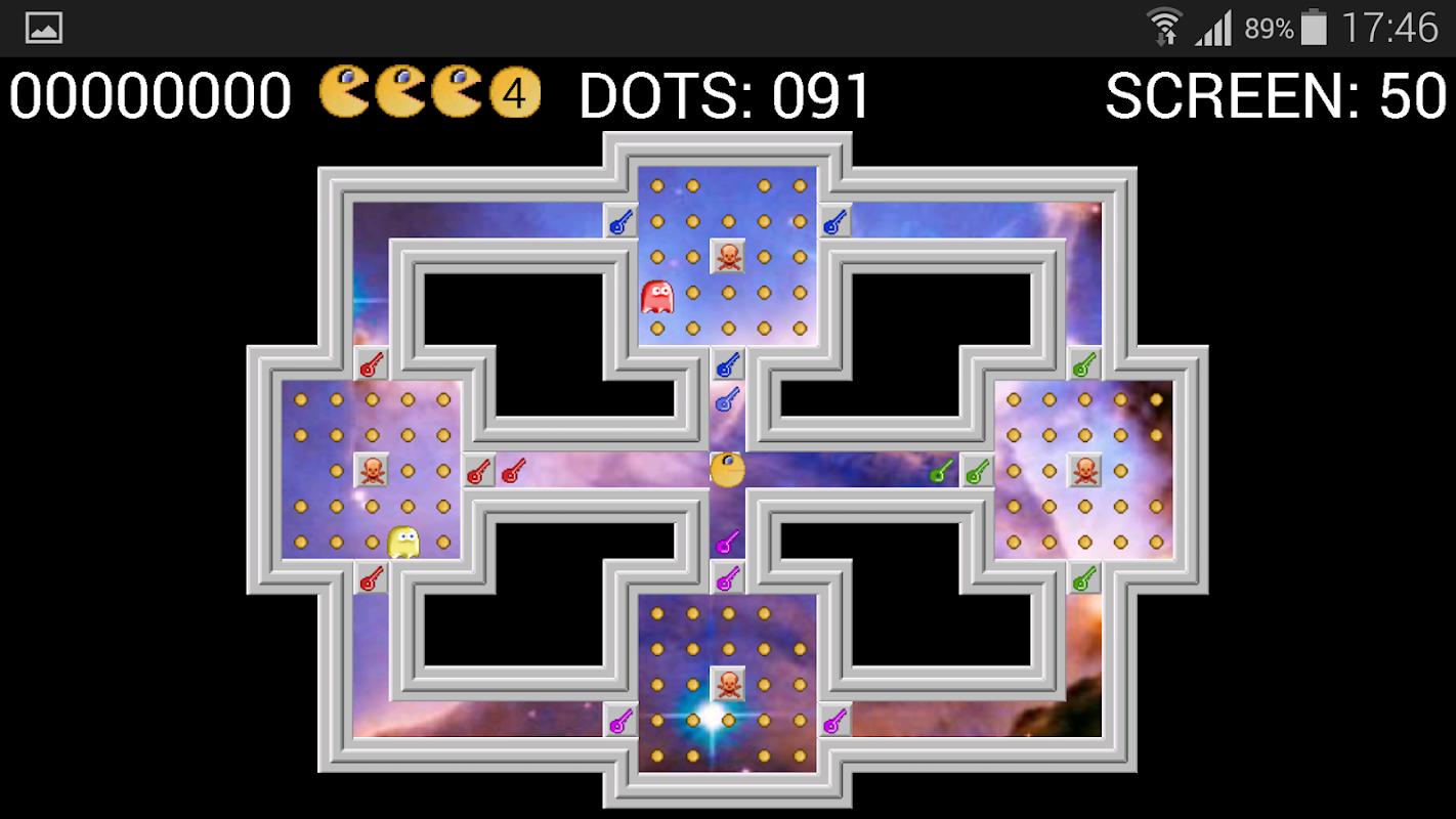 * To overcome the screens, the QUELMAN must eat all the dots and avoid being caught by the ghosts and dodging danger zones.