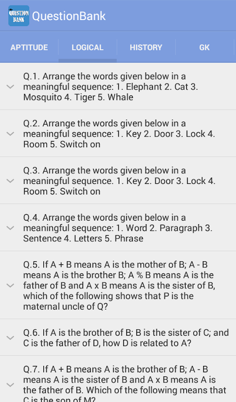 This app brings to you a collection of a number of questions from all areas be it science or maths or General Knowledge or aptitude or reasoning