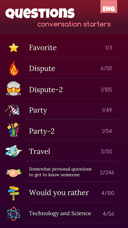 „Pytania. Rozmowy na początek” – nazwa mówi sama za siebie. Są zarówno początek rozmowy w firmie, jak i na bardziej osobiste spotkanie. Jeśli w towarzystwie znajomych nagle stanie się to dla Ciebie nudne, zawsze możesz skorzystać z naszej aplikacji, pytania pomogą rozpoznać Twoich znajomych i znajomych z nowej imprezy. Obecnie dostępne są następujące przedmioty: