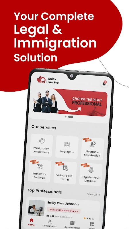 Szukasz specjalistycznych usług prawnych w Kanadzie? Quick Law Pro łączy Cię z zaufanymi kanadyjskimi prawnikami w zakresie doradztwa imigracyjnego, usług asystentów prawnych, rejestracji firmy, wirtualnego składania przysięgi, elektronicznego notarialnego i usług tłumaczeniowych - wszystko w jednej aplikacji!