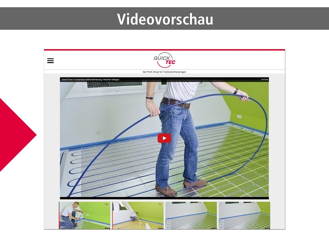 Mit dieser App haben Sie alle Videos zur QuickTherm Fußbodenheizung auf einen Blick. Die Montagevideos lassen sich schnell und einfach während der Verlegung abrufen – und zwar genau dann, wenn sie benötigt werden.