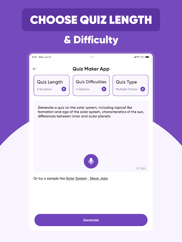 Szukasz potężnego generatora quizów AI lub generatora testów AI, który pomoże Ci tworzyć angażujące, spersonalizowane quizy w ciągu kilku sekund? Nasza aplikacja to najlepsze narzędzie do tworzenia quizów i generowania quizów przeznaczone zarówno dla nauczycieli, uczniów, jak i trenerów. Niezależnie od tego, czy przygotowujesz materiały do zajęć, czy zabawne gry edukacyjne, ta aplikacja sprawia, że jest to szybkie i bezwysiłkowe.