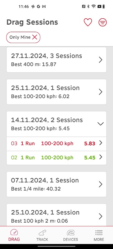 * Organizacja sesji: Wszystkie sesje są automatycznie sortowane według daty, typu, najlepszego czasu i innych parametrów, co ułatwia nawigację.