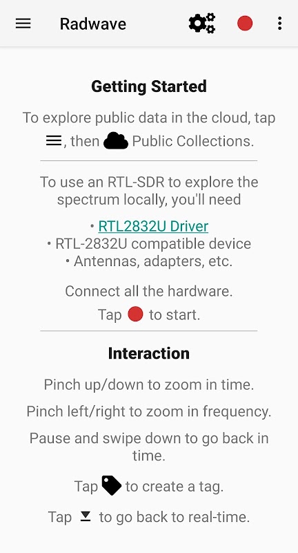 Radwave umożliwia interaktywne badanie widma RF w pełnej rozdzielczości. Możesz przeglądać ogromne zbiory danych podawane z chmury za pomocą tylko telefonu lub tabletu lub użyć klucza RTL-SDR i Sterownik RTL2832U do zbierania danych lokalnie na urządzeniu i interaktywnego przeglądania w czasie rzeczywistym.