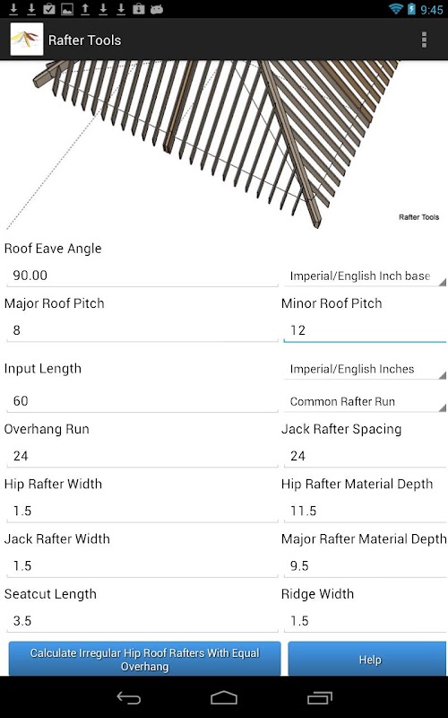 Rafter Tools to aplikacja na Androida z funkcjami obliczania złożonego kalkulatora kątów więźby dachowej.