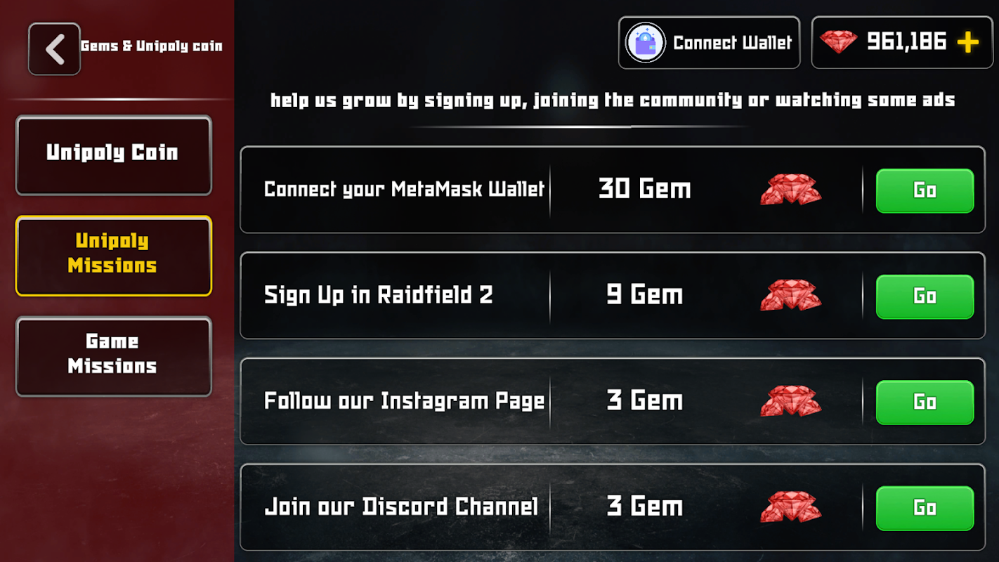 W Raidfield 2 Twoje umiejętności na polu bitwy nie służą tylko chwale, ale także zyskowi. Zdobądź naszą walutę w grze, Gem, dzięki swoim osiągnięciom i strategicznej rozgrywce. Wymień te Gems na Unipoly Coin, naszą ekskluzywną kryptowalutę, aby cieszyć się nagrodami w świecie rzeczywistym. Twoje umiejętności na polu bitwy przekładają się na cenne aktywa cyfrowe, dzięki czemu każde zwycięstwo jest bardziej satysfakcjonujące.