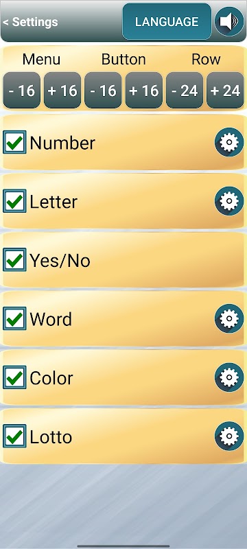 W ustawieniach pod słowem „Menu” znajdują się dwa przyciski do zmiany rozmiaru czcionki dla wszystkich nagłówków. Pod słowem „klucz” znajdują się również dwa klawisze do zmiany rozmiaru czcionki dla wszystkich klawiszy, a pod słowem „linia” również dwa klawisze do zmiany rozmiaru czcionki dla wszystkich poniższych wierszy.