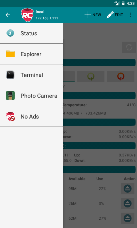 - Umożliwia odbieranie foldery i pliki z Raspberry Pi ® do smartfonu.