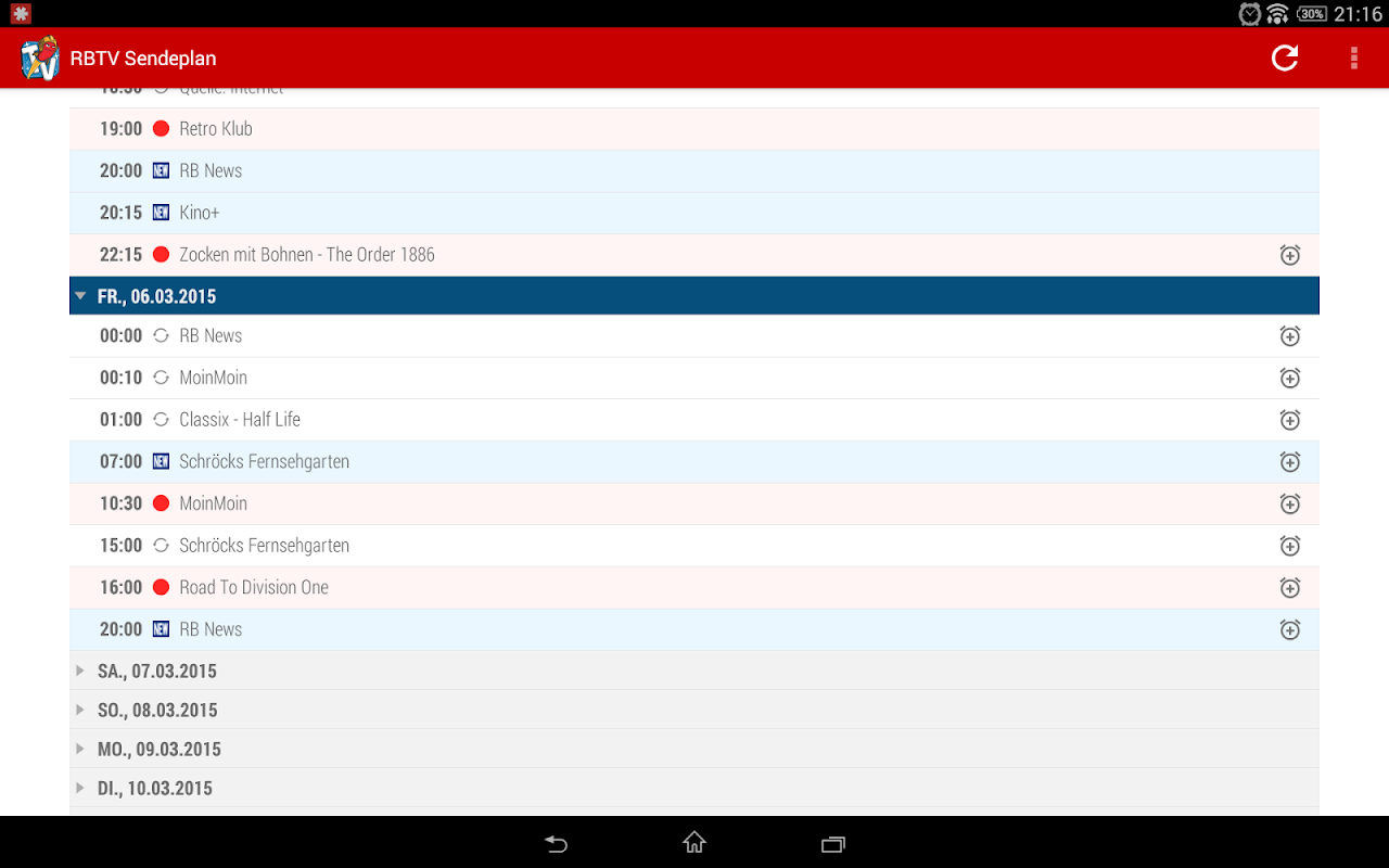 Verschafft Euch mit dieser App überall schnell eine Übersicht über den aktuellen Sendeplan des RBTV 24h Senders und lasst euch an die Sendungen erinnern, die ihr auf keinen Fall verpassen wollt!