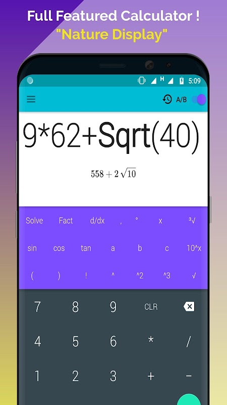 wskazówka Cechą wyróżniającą Kalkulator naukowy RealCalc jest dwuwierszowy naturalny wyświetlacz podręcznika, który wyświetla ułamki, wzory, pierwiastki kwadratowe i inne wyrażenia, tak jak w każdym podręczniku do rozwiązywania problemów matematycznych. Możemy skorzystać z kalkulatora cal - kalkulator naukowy | Zaawansowany kalkulator pomocniczy Math