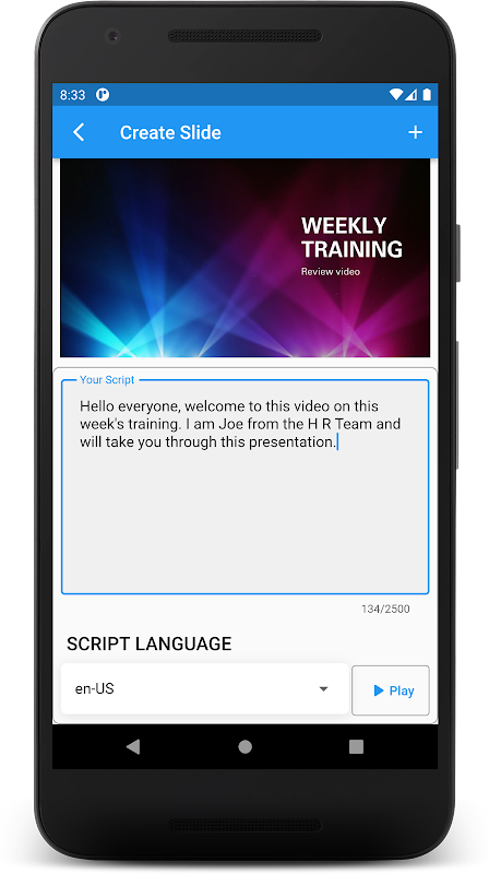 Wszystko, czego potrzebujesz, to dostarczenie tła/slajdu obrazu i wprowadzenie skryptów tekstowych. Aplikacja wykorzystuje głosy tekstu na mowę (Tts) telefonu do tworzenia podkładów głosowych i łączy slajdy z podkładami głosowymi w celu utworzenia wideo.