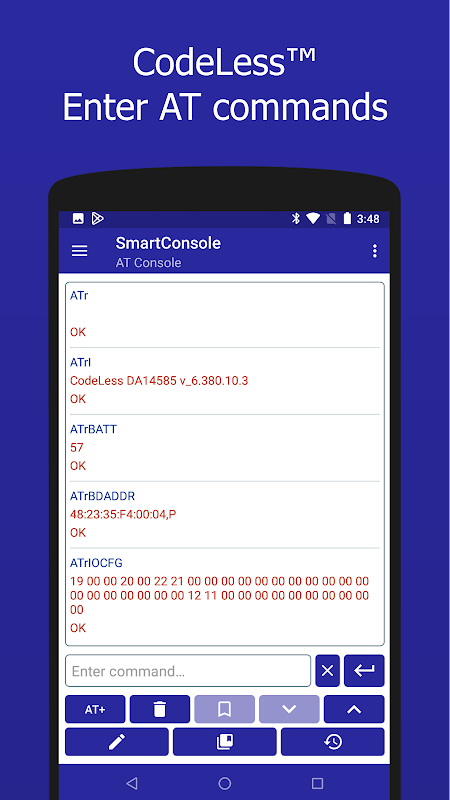 CodeLess™ umożliwia sterowanie urządzeniem równorzędnym za pomocą kompleksowego zestawu poleceń AT. Za pomocą tych poleceń można odczytywać i modyfikować ustawienia urządzenia równorzędnego oraz sterować podłączonymi do niego urządzeniami peryferyjnymi. Możesz wydawać polecenia tekstowe AT bezpośrednio za pośrednictwem konsoli AT dostępnej w aplikacji lub generować je z abstrakcji interfejsu użytkownika dostarczonych przez aplikację.
