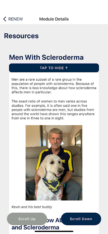 Renew Scleroderma pomaga osobom z twardziną skóry radzić sobie ze zmęczeniem i poprawiać samopoczucie. Obejmuje coaching zdrowotny prowadzony przez przeszkolonych mentorów rówieśniczych. Renew Scleroderma umożliwia użytkownikom odczytywanie informacji o twardzinie oraz ustalanie i śledzenie tygodniowych celów oraz wykonywanie działań związanych z tymi celami.