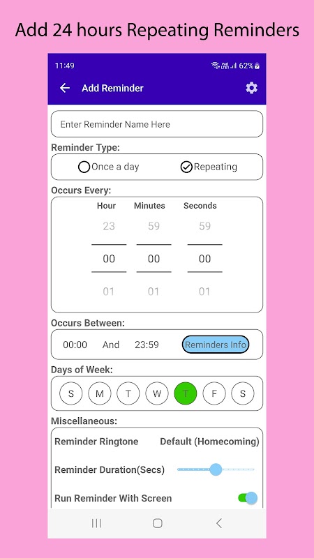 Ta aplikacja pomaga ustawić jednorazowe lub cykliczne przypomnienia o wszystkich codziennych czynnościach (ćwiczenia, picie, jedzenie, sen, leki, praca itp.).