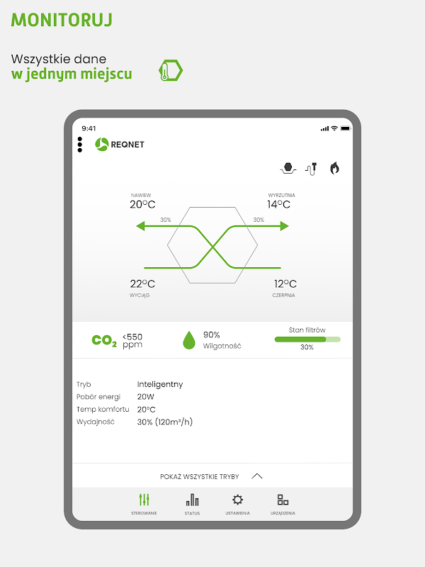 Z aplikacją REQNET CONTROL sterujesz swoim rekuperatorem REQNET lub iZZi bez potrzeby używania dodatkowego panelu na ścianie. Wystarczy telefon z dostępem do Wi‑Fi.