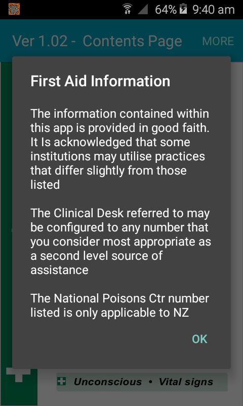 Essential First Aid information suitable for individuals with some first aid experience who may be first on scene incident responders. Packaged in an easy to access app with no adds or unnecessary clutter. Each section can be accessed via a single click. There is also provision to initiate a call to a second level help facility by way of a pre-configured number.