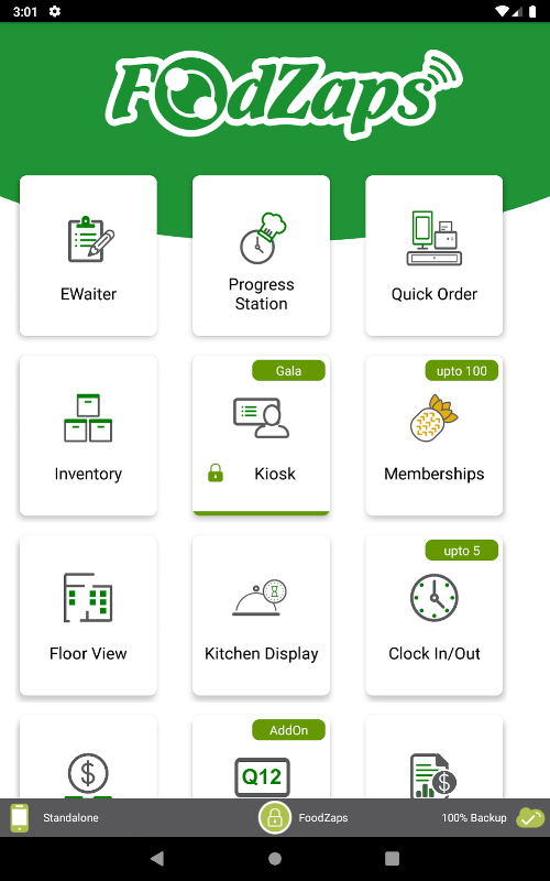 FoodZaps to kompleksowe rozwiązanie używane przez kelnerów do wprowadzania zamówień lub podwójnego potwierdzania samodzielnego składania zamówień od klientów, na miejscu w czasie rzeczywistym i na miejscu, z wybranymi urządzeniami operacyjnymi z systemem Android, tabletem, podręcznym telefonem komórkowym i terminale. Zamówienia zostaną natychmiast wysłane do drukarki kuchennej i ekspozytora kuchennego. Nie ma potrzeby zapamiętywania menu przez personel, ponieważ menu jest wyświetlane na urządzeniu przenośnym, co stanowi doskonałą okazję dla personelu do sprzedaży, skupienia się na gościnności i podniesienia poziomu obsługi klienta.