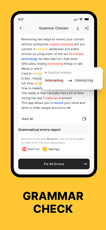 Zintegrowane narzędzie aplikacji Grammar Checker pomaga użytkownikom sprawdzać i poprawiać angielskie błędy gramatyczne, ortograficzne i interpunkcyjne. Gdy zawartość przechodzi przez kontrolę gramatyczną, uwypukla wszystkie problemy ortograficzne i gramatyczne. Następnie możesz rozwiązać te problemy jednym kliknięciem.