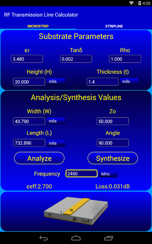 Narzędzie do analizy i syntezy RF i mikrofalowych linii transmisyjnych opartych na fizycznych parametrów podłoża. Narzędzie to może być wykorzystane do obliczenia szerokości linii i grubości z danej impedancji charakterystycznej i długości fali. Może być również stosowany do analizy impedancji i długości fali istniejącej linii wprowadzając jego szerokości i długości.