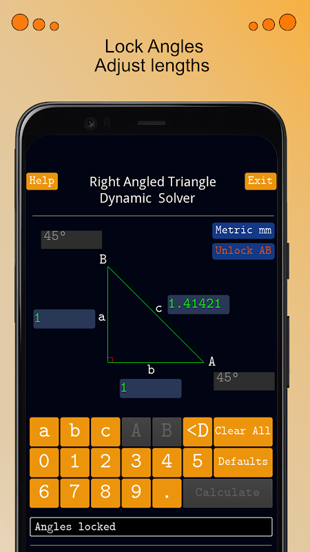 Konwerter kątów umożliwia wprowadzanie stopni lub radianów oraz konwersję do i ze stopni, minut i sekund. Otrzymaną wartość można przenieść do trójkątnych pól obliczeniowych.