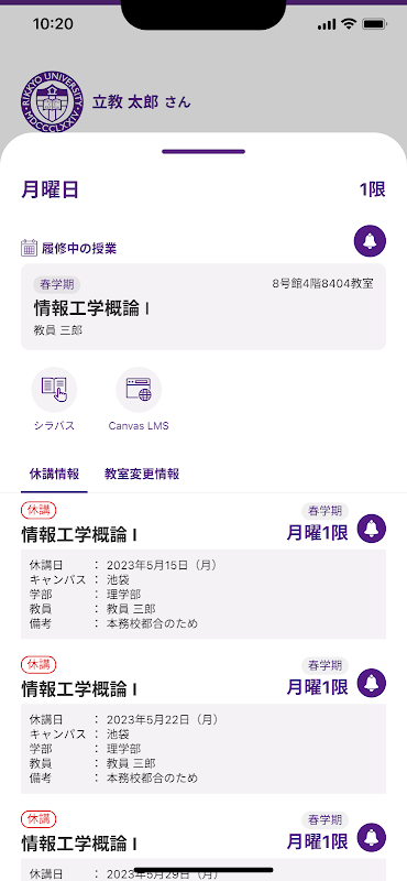 Oprócz informacji o zajęciach, takich jak rozkłady jazdy i informacje o odwołaniu zajęć, będziemy dostarczać informacje przydatne w życiu uczelni, takie jak ogłoszenia z uczelni i rozkłady jazdy autobusów. Możesz również otrzymywać powiadomienia z uczelni automatycznie za pomocą powiadomień push.