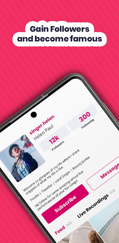 ⦁ POKÓJ CZATOWY DLA WIELU GOŚCI: Utwórz transmisję na żywo i dodaj do 4 znajomych/fanów na tym samym ekranie w tym samym czasie. Ciesz się czatami na żywo i powiększaj grono fanów na całym świecie. Zostań celebrytą.